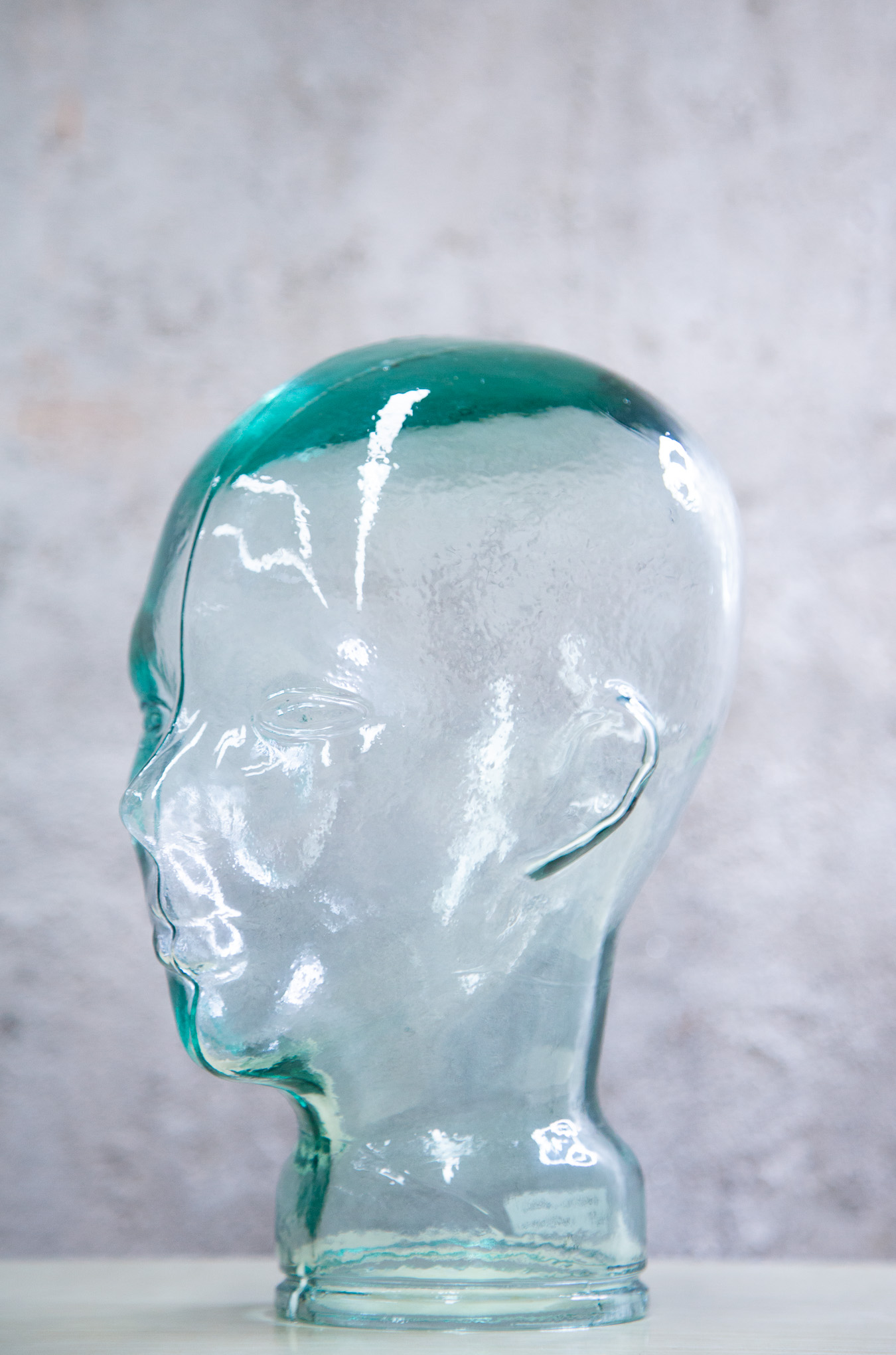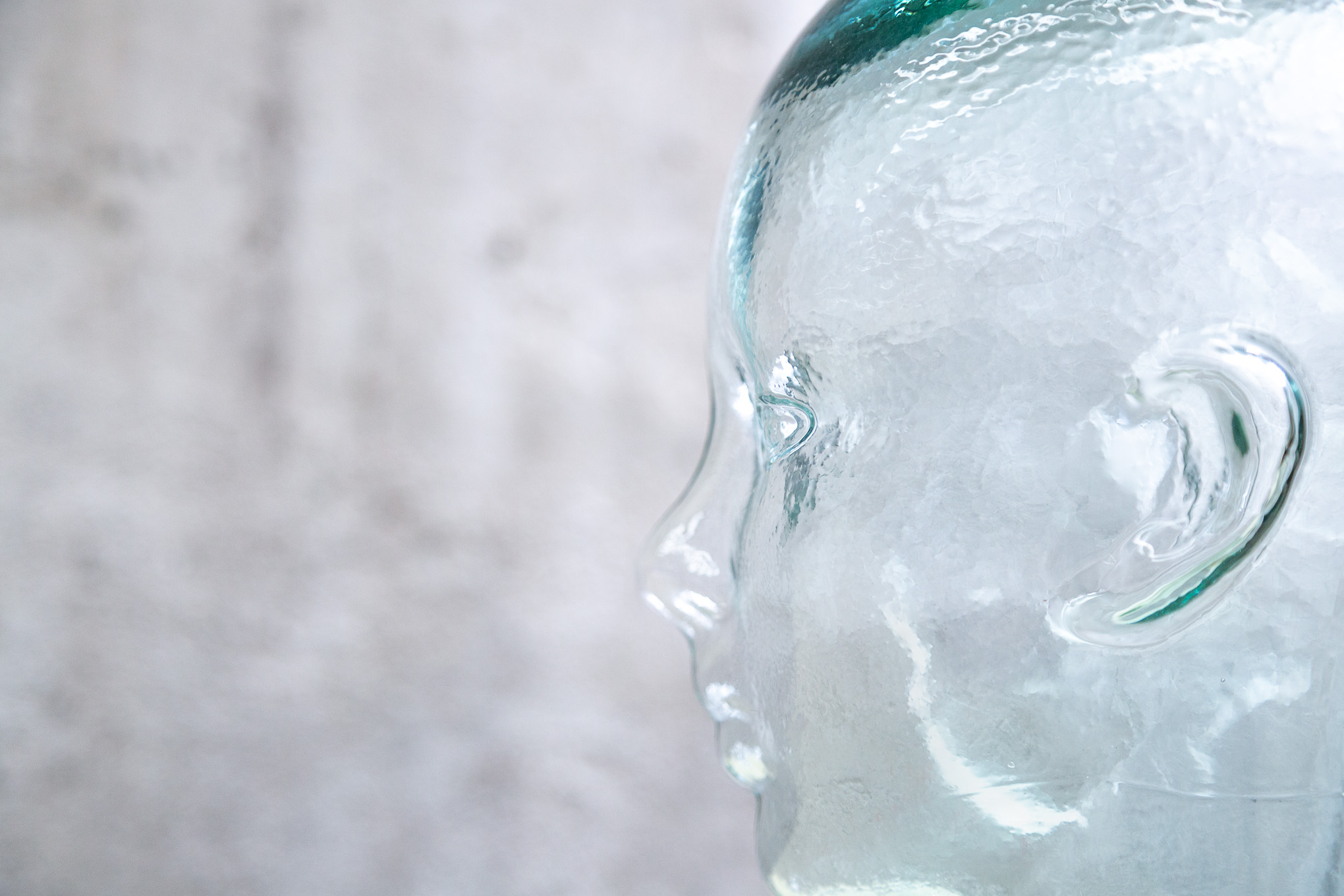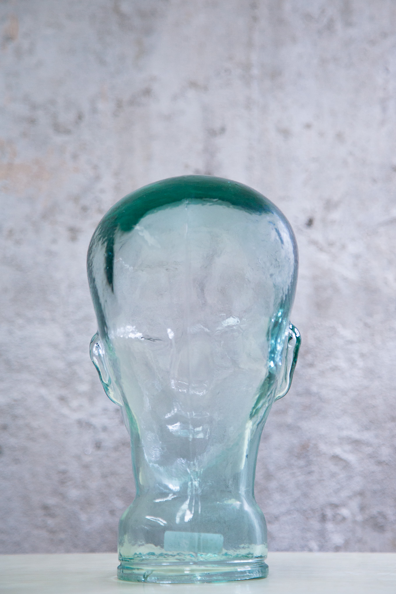 Cabeza de cristal, hueca por dentro, tamaño real.