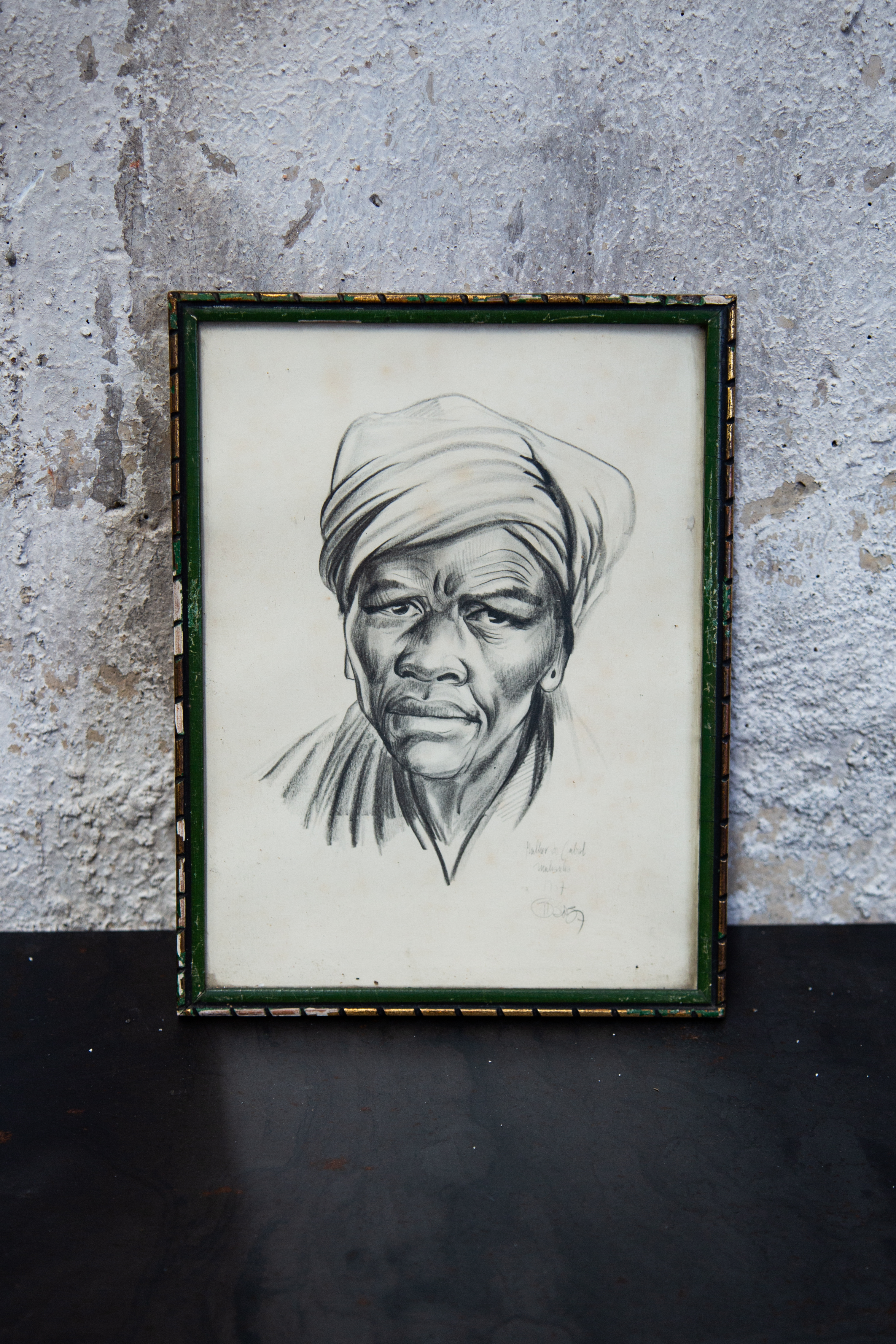 Retrato carboncillo marco verde anciano