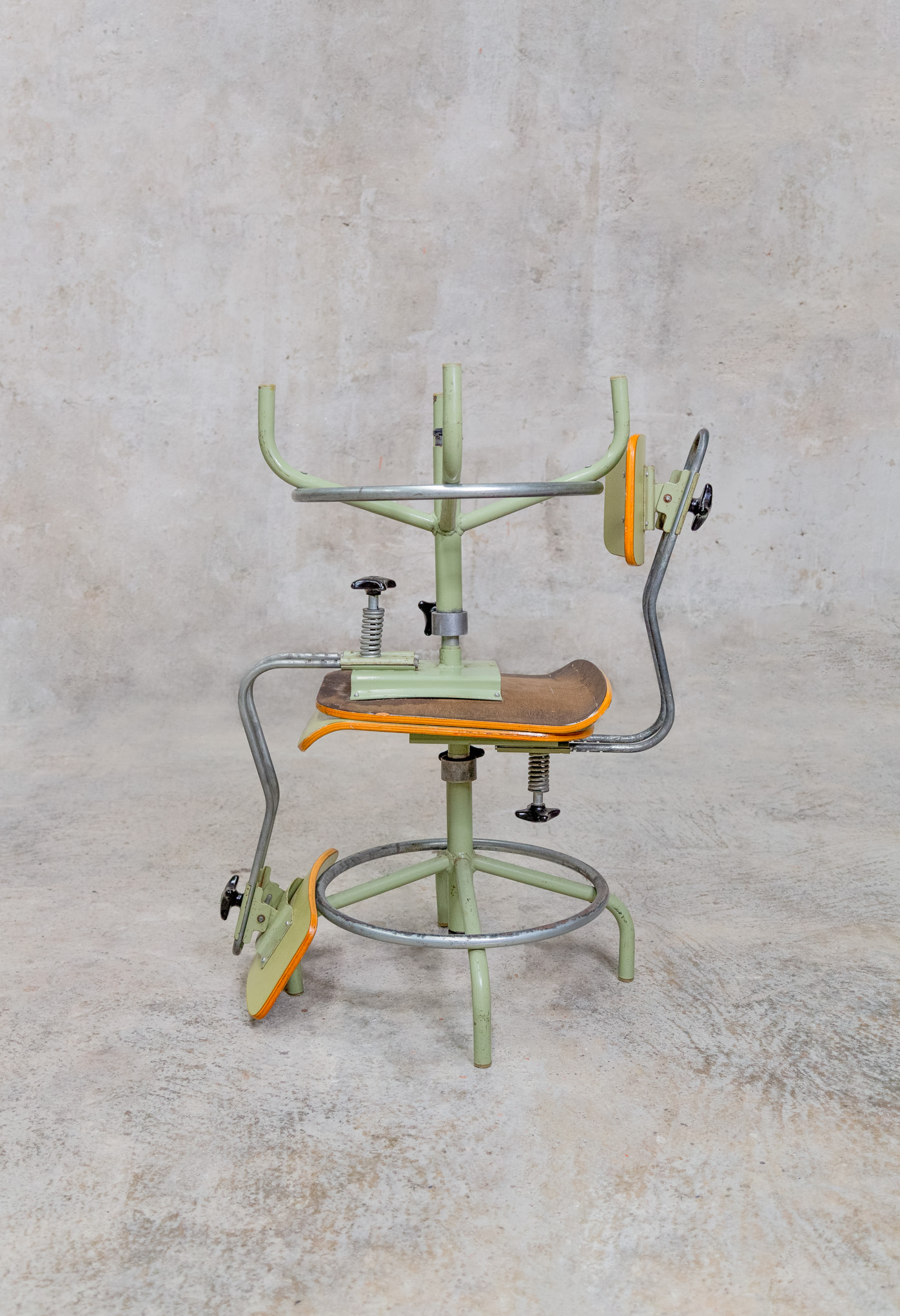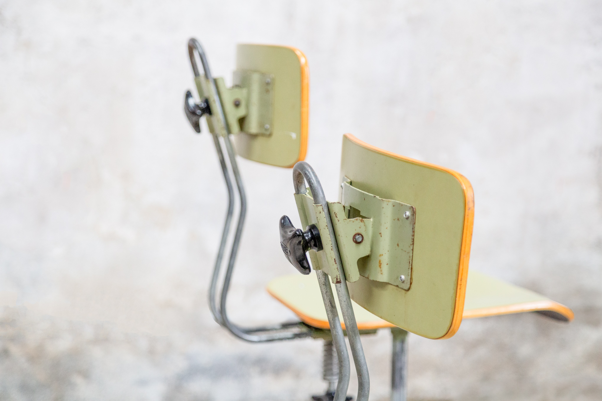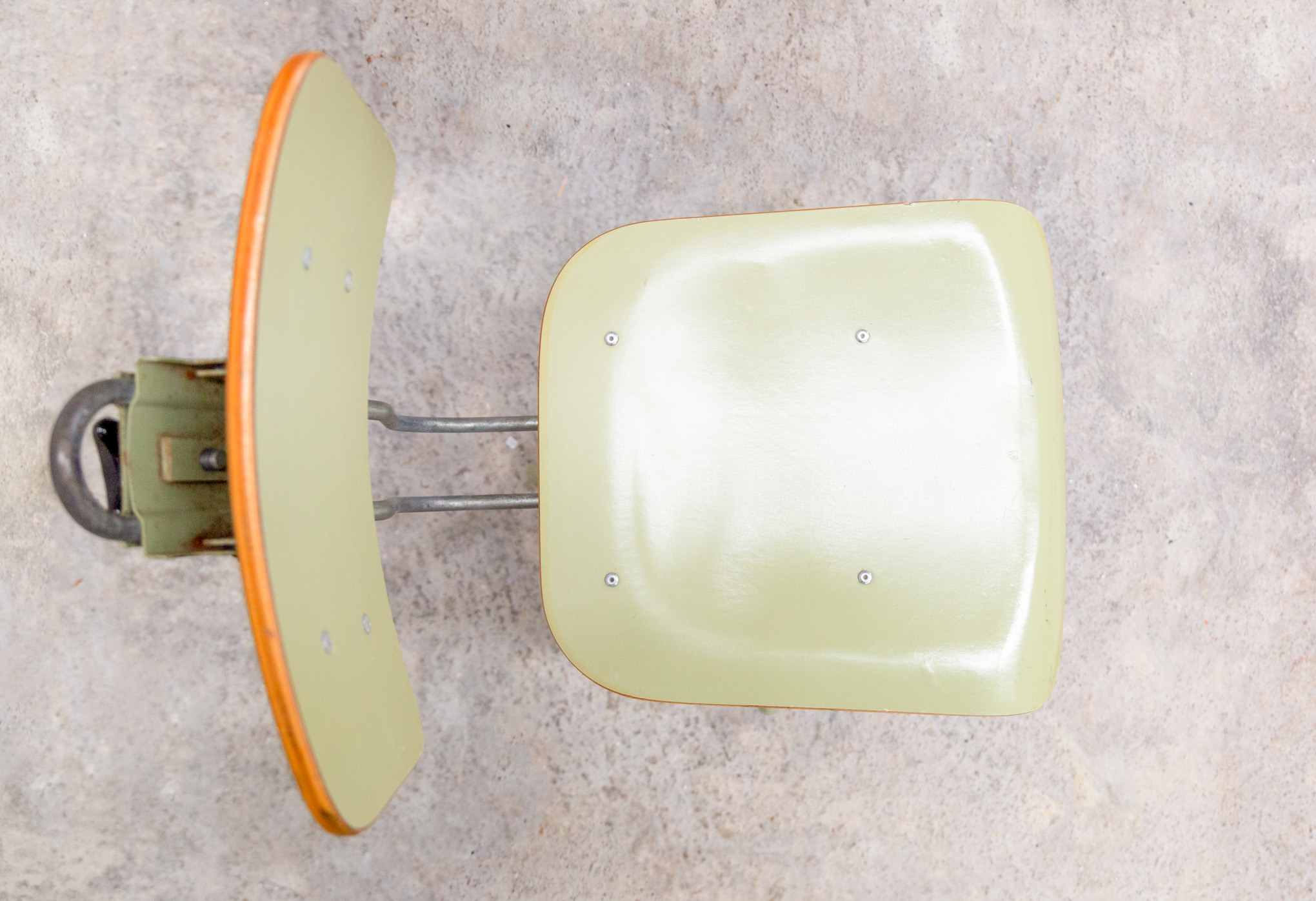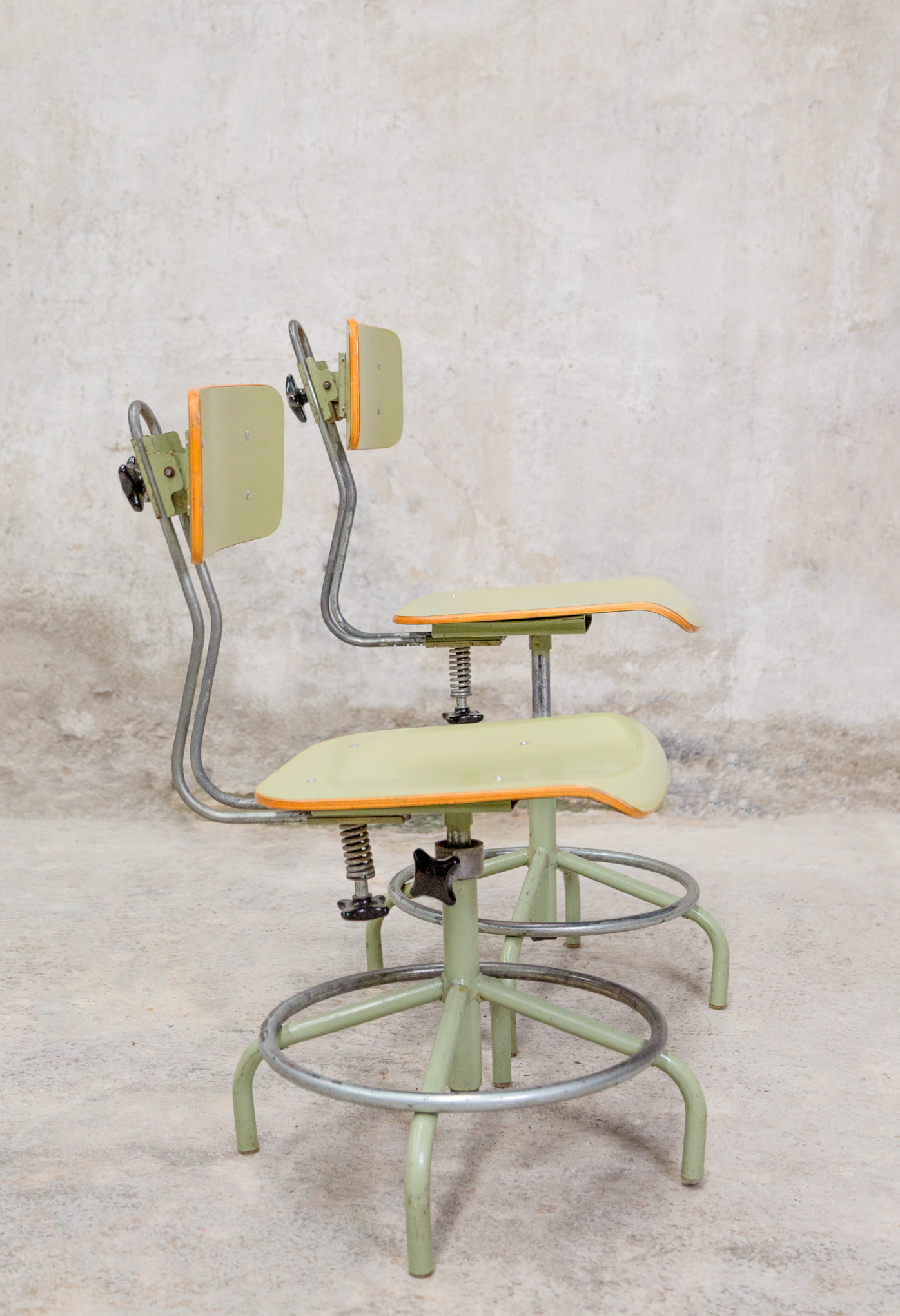 Silla precedente de un taller de costura. Con estructura de metal y asiento y respaldo de contrachapado verde. Reclina, gira y se regula la altura