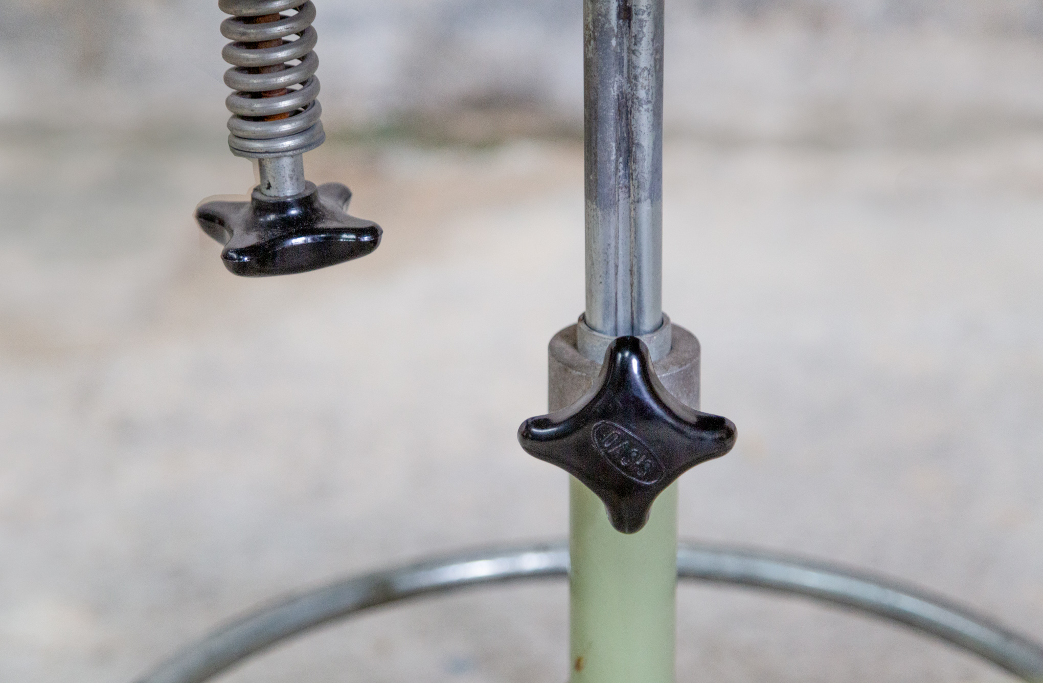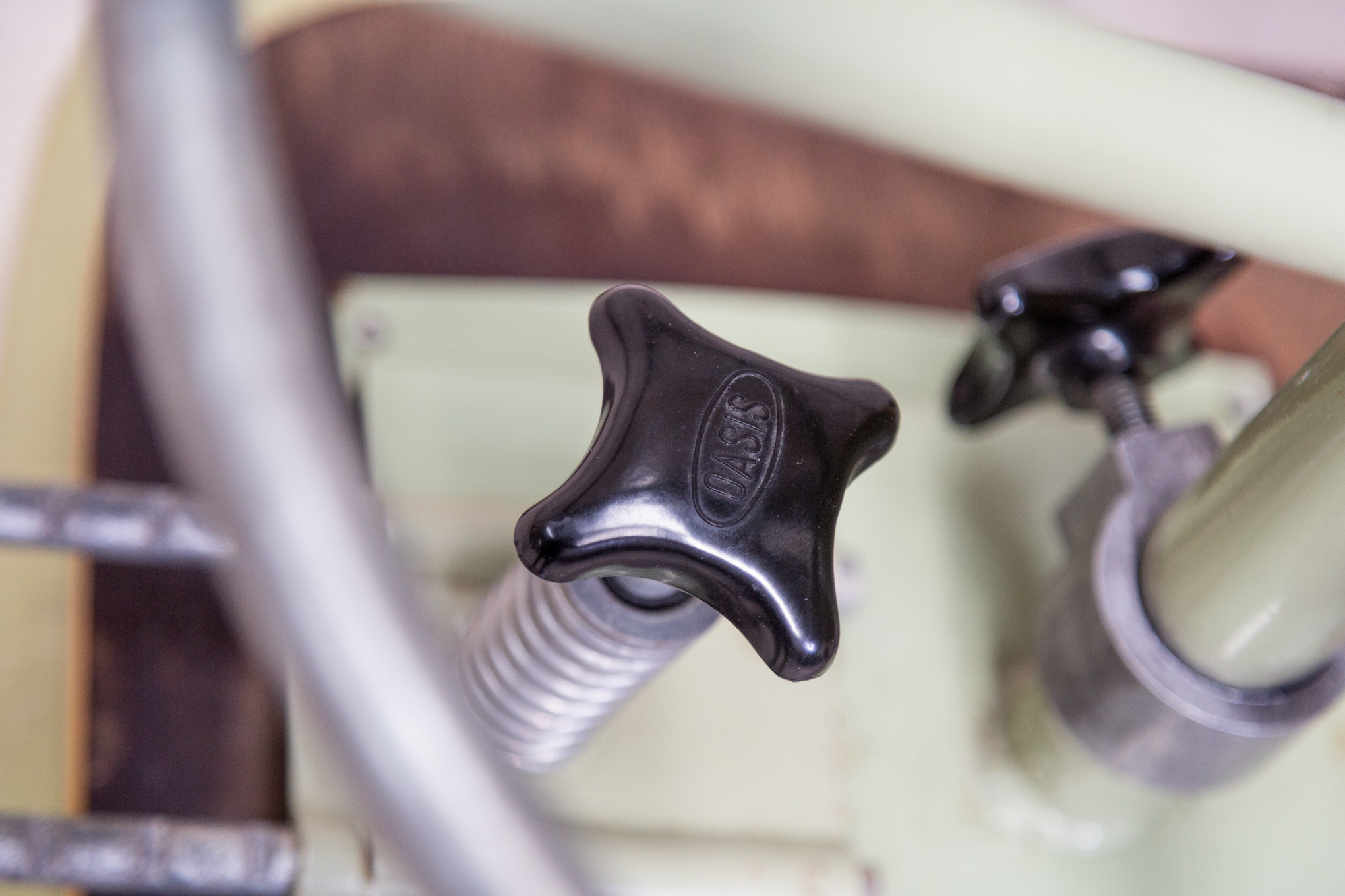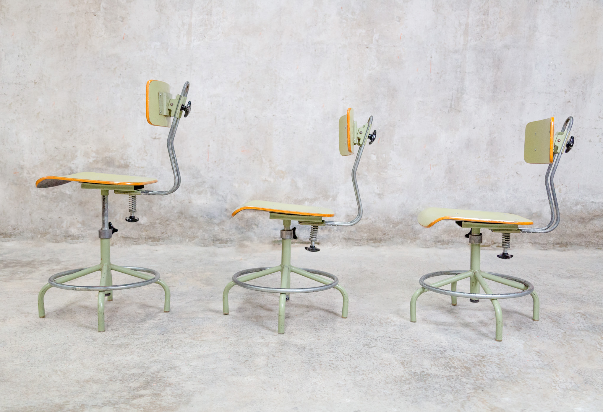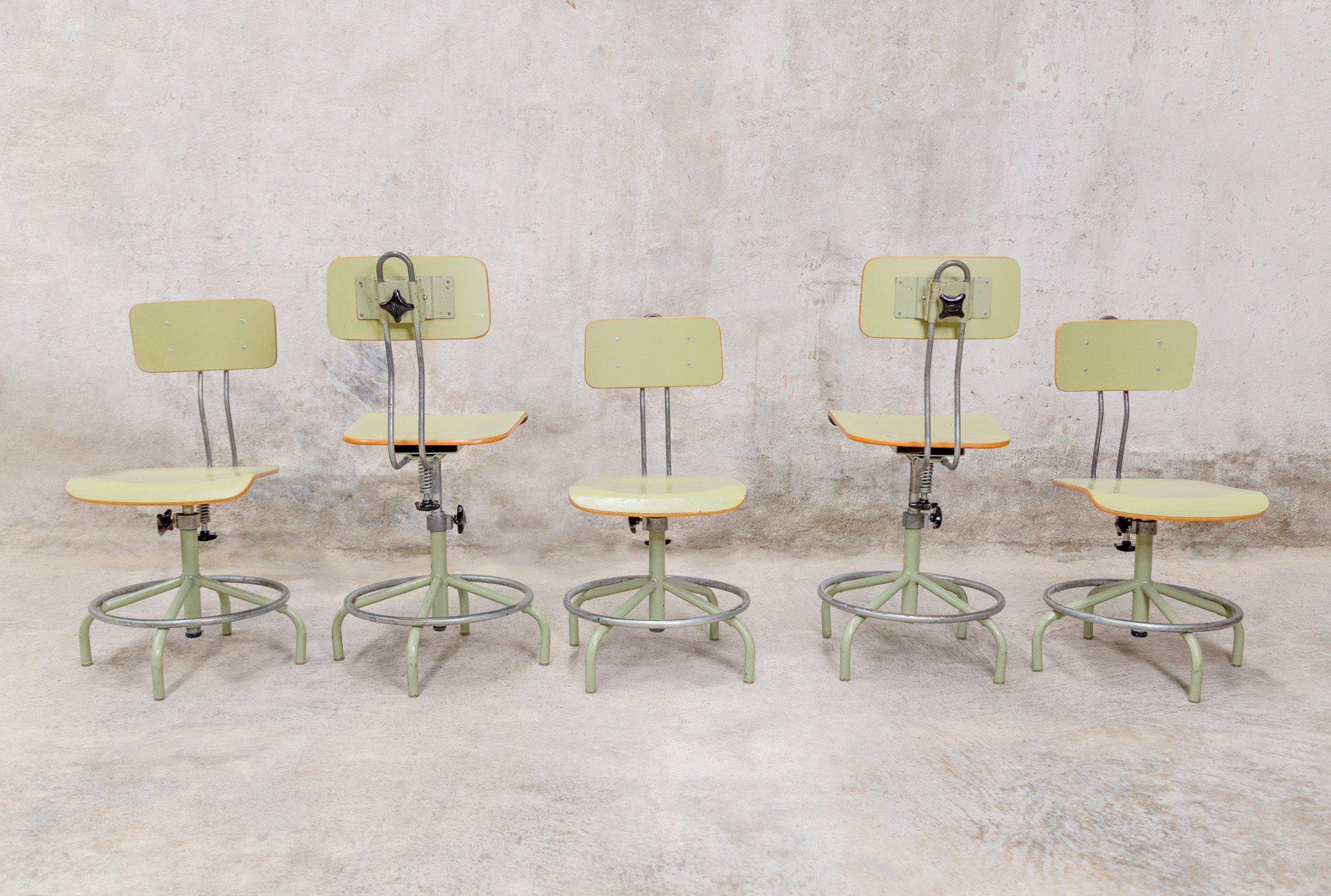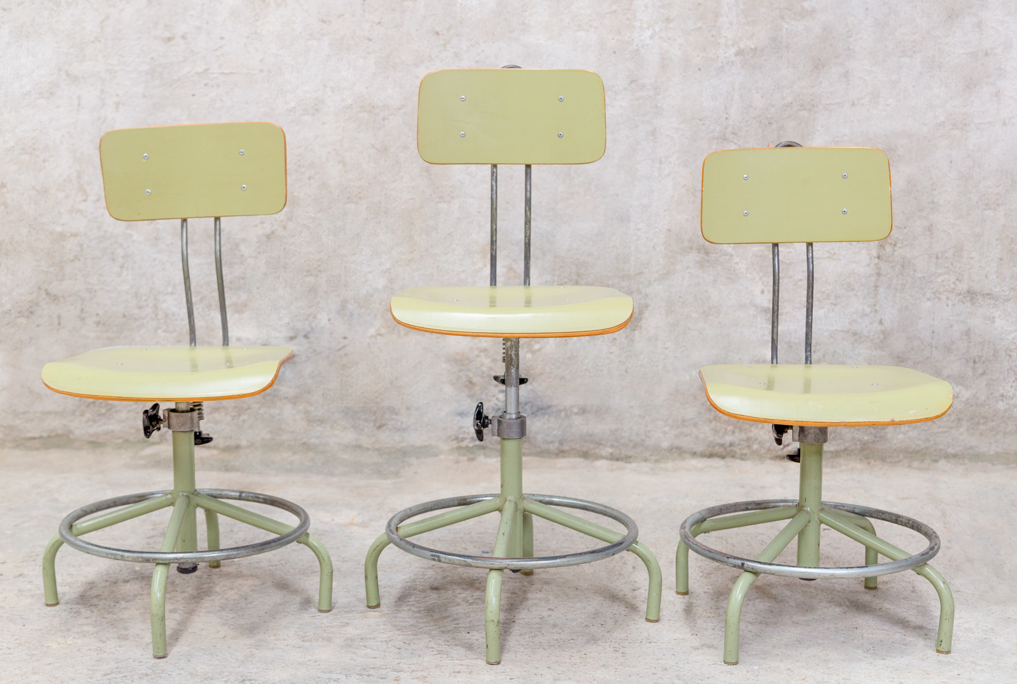 Silla precedente de un taller de costura. Con estructura de metal y asiento y respaldo de contrachapado verde. Reclina, gira y se regula la altura